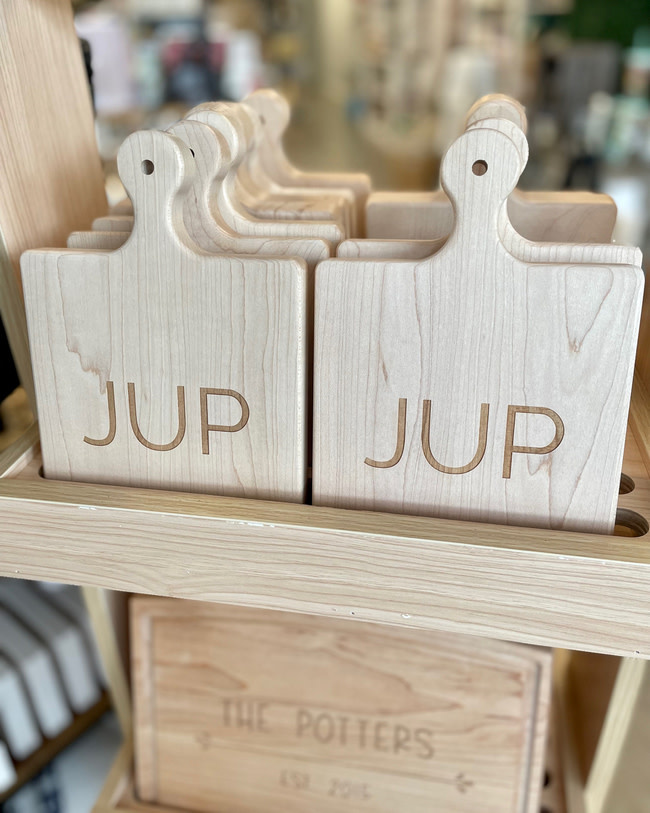 Crafted of premium hard rock Maple wood, this gorgeous cutting + charcuterie/cheese board with juice groves is a workhorse that can be used for preparing food or as a serving board or tray for cheese & charcuterie. Etched with JUP to represent Jupiter, FL