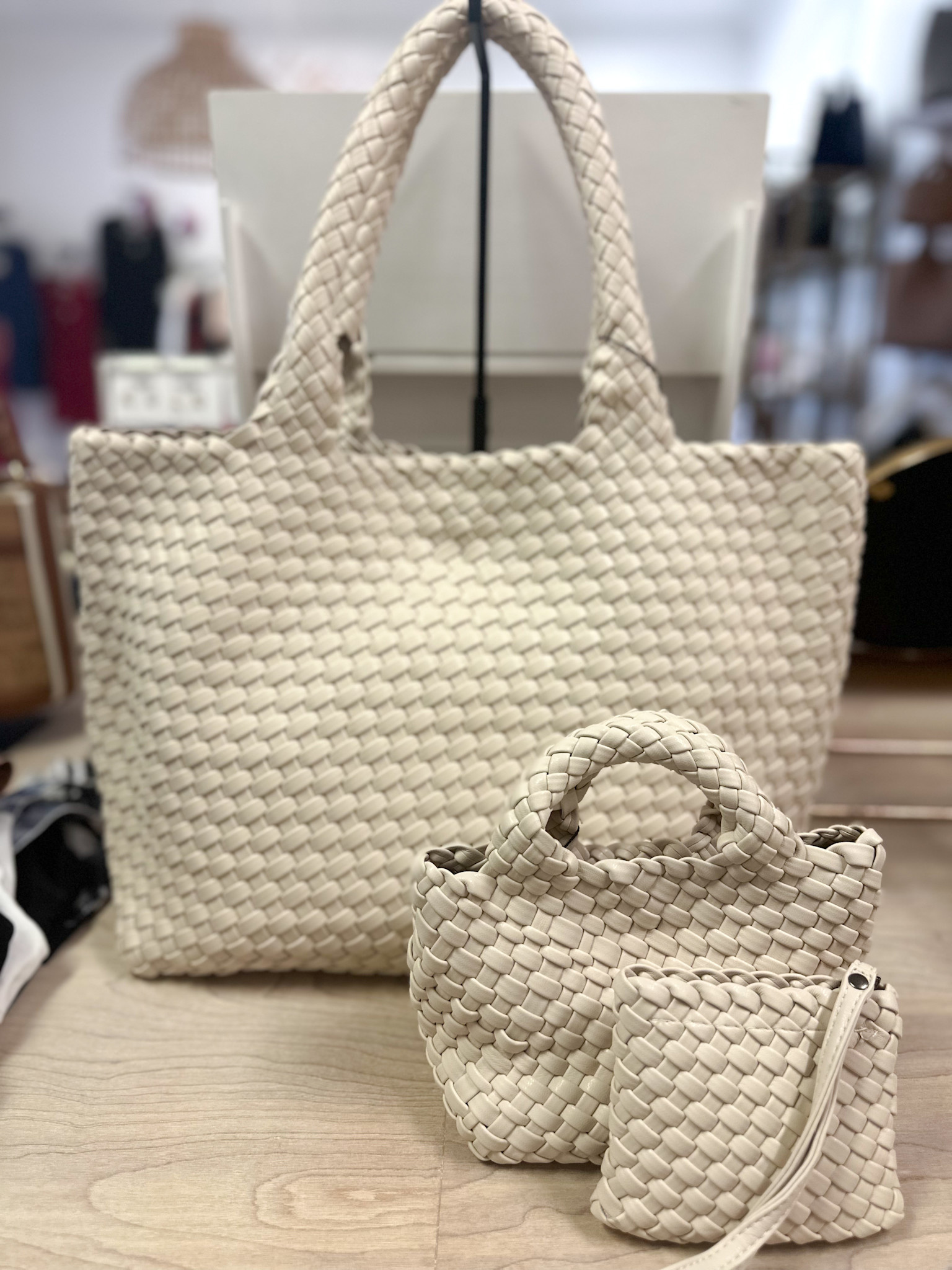 Woven is the new way to neoprene & our largest tote gets the heavy lifting done. This light blue carryall comes with a large pouch for organization. Perfect to use as a travel bag, fits under a plane seat or your every day fits-your-whole-life-inside tote